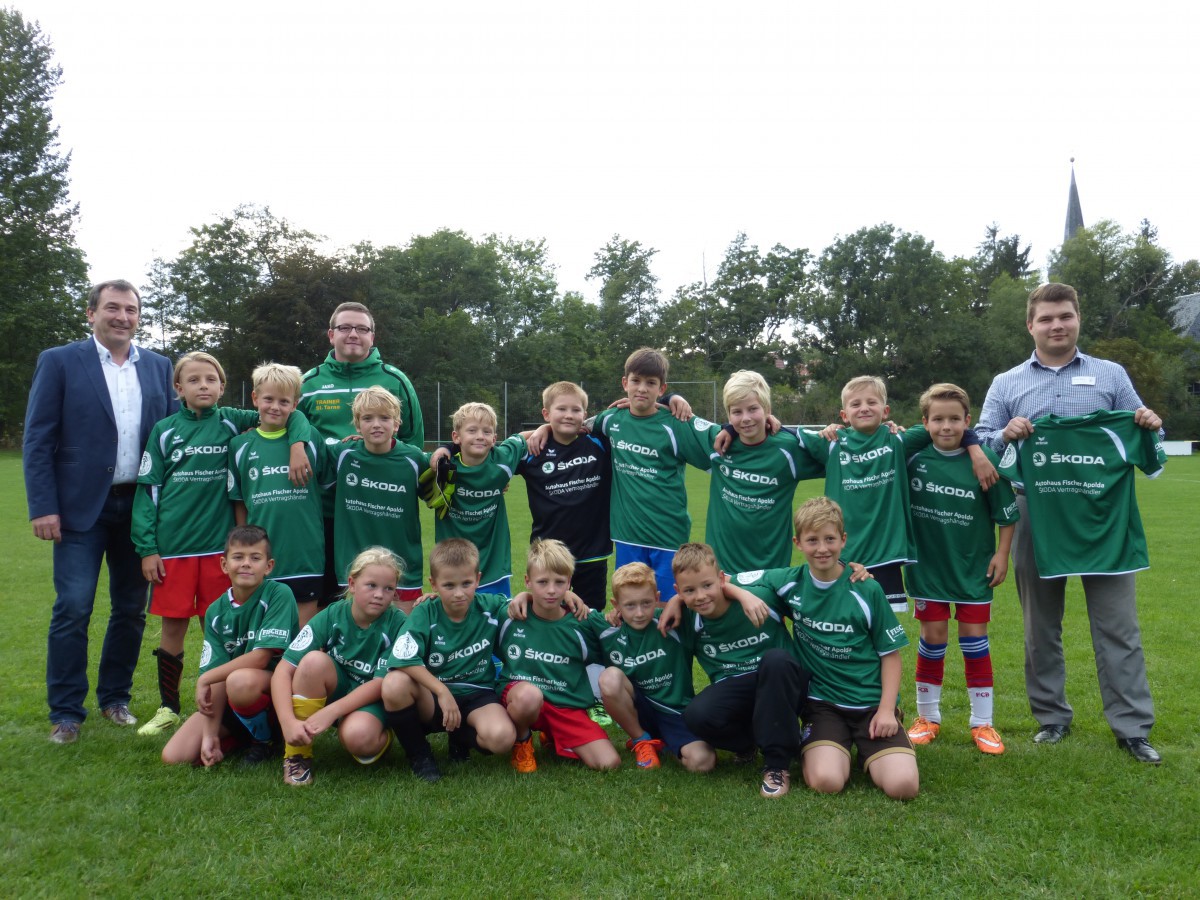 Die E-Junioren um ihren Trainer Stefan Tarne bedanken sich ganz herzlich beim Autohaus Fischer aus Apolda, die Wort gehalten hatten und ihren Vorbildern, die jetzt im Männerbereich angekommen sind.