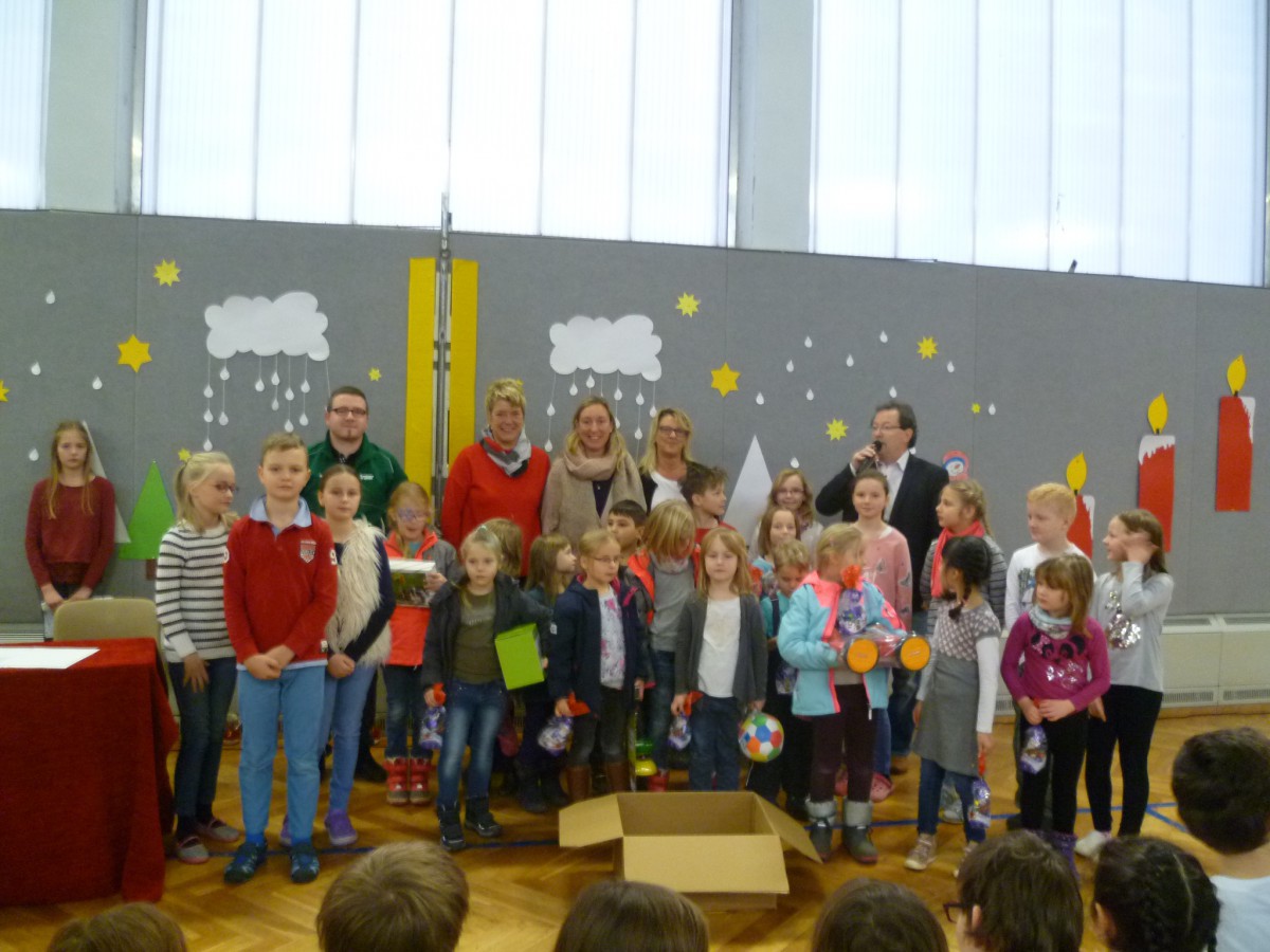 So überreichte dieser dem Regenbogenhaus eine Kiste mit Bewegungsspielen im Wert von 120€ und jedem der anwesenden Kindergartenkindern eine süße Weihnachtsüberraschung und der Schule Fußbälle und Leibchen im gleichen Wert.