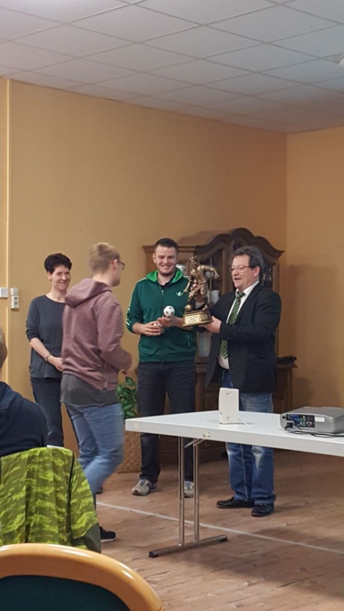 Weiter ging es mit den Ehrungen von verdienstvollen Mitgliedern oder Mannschaften und Förderern. Der Ehrenausschuss hatte es in diesem Jahr recht einfach bei der Auswahl der Mannschaft des Jahres 2017, ging nicht ein lang gehegter Wunsch des Vereins in Erfüllung, Aufstieg der 1. Männermannschaft wieder in die Kreisliga. In Abwesenheit des aktuellen Mannschaftskapitäns und des Trainers nahm der damals noch wirkende Käpten Mario Becker die Trophäe aus den Händen des Präsidenten in Empfang. Auf Vorschlag des Ehrenausschusses erhielt in diesem Jahr aus den Händen von Sportfreund Häfner Kevin Trepanowski die Ehrung als Spieler des Jahres 2017. Verdient gemacht hat er sich insbesondere durch seine über mehrere Jahre hochmotivierte Spielereinstellung- und leistung, seine Treue zum Verein und natürlich sein nicht unwesentlicher Anteil am Aufstieg der 1. Männermannschaft. Weiter ging es mit dem Mitglied des Jahres, Manja Plotka, die in der Fülle ihrer Aufgaben- Co- Trainer bei den F-Junioren, Mitglied der Küchencrew und des Vorstandes - im Verein wirbelt. Bei keinem Turnier fehlen ihre helfenden Hände. Danach folgte die Auszeichnung von Mario Becker mit der Ehrenmedaille des Kreissportbundes (Bericht folgt). Eine weitere Auszeichnung konnte nicht durchgeführt werden, da der Sportfreund nicht anwesend war. Sportfreund Häfner gab danach bekannt, dass der Ehrenausschuss des Vereins Katrin Zeitze für den Ehrenamtspreis 2018 des Weimarer Landes vorgeschlagen hat. (Bericht folgt)