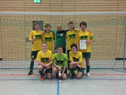 Nochmal die "Halle rocken" und Spass haben wollten unsere B- Junioren beim letzten Hallenturnier der Saison. Der Hallencup des FC Thüringen bot diesmal die Bühne für unsere, mittlerweile, Hallenspezialisten. Und schon im ersten Spiel überrannten die Jungs, um Capitano Tom Jennicke ,die SG SV Aga Gera. Denn da die Spielzeit nur acht Minuten betrug wollten wir ohne großes "abtasten" sofort Torgefahr ausstrahlen. Und das gelang bravorös! es waren noch nicht einmal dreißig Sekunden gespielt und wir führten durch einen Doppelpack von Florian Petzold 2:0! Den geschockten Randgeraern blieb wenig Zeit sich aufzurappeln denn fast im Sekundentakt schlug es immer wieder im Tor des völlig überforderten Gegners ein. Durch Kevin Trepanovski, erneut Petzi, ein Doppelback von Eric Zeitz, abermals Petzi und ein Doppelpack von Maximilian Stock schraubten wir das Ergebnis auf ein sagenhaftes 9:0 !!! Was für ein Start! Aber schon im zweiten Spiel erwartete uns mit dem Gastgeberteam eine weitaus schwierigere Aufgabe. Die Jenaer gewarnt von unserem ersten Spiel begannen sehr konzentriert hatten aber unserer Angiffswucht wenig entgegenzusetzen. Durch Tore von Kevin, "Stöckchen", erneut Kevin sowie "Petzi" mit seinem mittlerweile fünften Turniertreffer gewannen wir verdient 4:0! Das dritte Spiel brachte uns einen, in dieser Hallensaison, fast ständigen Begleiter. Mit der SG Oberweimar 2. duellierten wir uns schon in einigen Turnieren der Saison und gingen immer als Sieger von der Platte. Gerade gegen diese Mannschaft sind unsere Jungs hochmotiviert, fügten sie uns doch die in dieser Saison bitterste Niederlage zu. Und so gewannen wir auch dieses Spiel durch einen Doppelpack von "Petzi" und ein KOPFBALLTOR von "Stöckchen" mit 3:0 ! Der stärkste Gegner erwartete uns in unserem vierten Turnierspiel. Mit dem Naumburger SV 05, ebenfalls ein alter Bekannter, stand uns ein Mitfavorit um den Turniersieg gegenüber. Das taktisch wohl beste Turnierspiel wurde so zu einem "Finale" denn auch die Domstädter hatten bis dahin alle Partien gewonnen. Aber durch das starke Torverhältnis würde uns ein unentschieden reichen. Tom brachte uns nach einer schönen Kombination in Führung. Naumburg erhöhte das Risiko und in einer Phase als sich Tom und Kevin nach kleineren Blessuren auf der Bank erholten kassierten wir kurz nach ihrer Rückkehr auf die "Platte" den Ausgleich. Die letzten Minuten überstanden wir jedoch schadlos und es blieb beim Remis. Dem Turniersieg einen riesen Schritt näher ging es in die letzten beiden Partien. Mit dem Heuckewalder SV stießen wir auf einen uns völlig unbekannten Kontrahenten. Und von Beginn an sahen wir uns einer sehr defensiv eingestellten Mannschaft gegenüber. Zwar konnten wir uns einige hochkarätigen Möglichkeiten erspielen, doch irgendwie fehlte uns nun die Abgeklärtheit im Abschluß. Vielleicht ging es ja in den vorangegangenen Partien zu einfach oder die Kraft und somit auch die Konzentration ließ nach. Denn wegen der Ferien fanden nur sieben Spieler den Weg nach Jena. Trotzdem gewannen wir nach Toren von "Petzi" und Kevin ungefährdet mit 2:0. Im letzten Spiel trafen wir auf die SG Isseroda und uns bot sich ein ähnliches Bild. Klar überlegen vergab allein Tom drei vier absolute "Hunderter". Doch wir hatten ja mit Kevin einen absoluten "Killer" in unseren Reihen, der immer wenn er gebraucht wurde voran ging und die Entscheidung herbeiführte. So markierte er auch diesmal das wichtige 1:0. Und da gab es ja noch "Petzi" mit der eingebauten Torgarantie, der mit seinem neunten Turniertreffer die Entscheidung und den Turniersieg brachte. Und sich selbst die Torjägerkrone holte. Aber auch alle anderen zeigten einmal mehr was sie drauf haben und versprühten ihre Freude am Hallenfußball. Zu erwähnen wäre noch Felix Rothe der ohne zu murren den erkrankten Philipp Häfner in unserem Tor vertrat und seine Sache super machte. Konnte er in fünf Spielen seinen Kasten sauber halten war er nur einmal beim Remis geschlagen. Und natürlich Hannes Kohler, der leider als einziger Feldspieler ohne Torerfolg blieb, seine Sache in der Verteidigung aber super machte. Nun richtet sich unser Blick auf die bevorstehenden Aufgaben, im Freien, denn auch da ist noch einiges möglich. Trotzdem sehen wir gerne zurück auf eine unserer erfolgreichsten Hallensaisons mit insgesamt SECHS Turniersiegen!!!!!!
